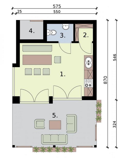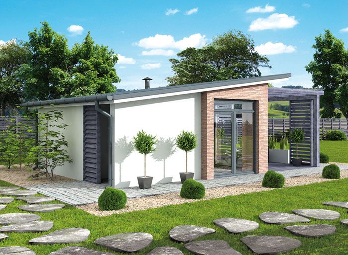 Technologia tradycyjna :- powierzchnia użytkowa (z werandą) -42m2 - powierzchnia zabudowy budynku (bez werandy) -31,34m2 - kubatura - 112.15m3 - ściany zewnętrzne nośne murowane grubości 25cm - wszystkie ściany wykonane pustaków ceramicznych "POROTHERM" - wysokość budynku 3,93m - dach jednospadowy 15° - więźba dachowa drewniana - pokrycie dachu - stalowe panele drewniane