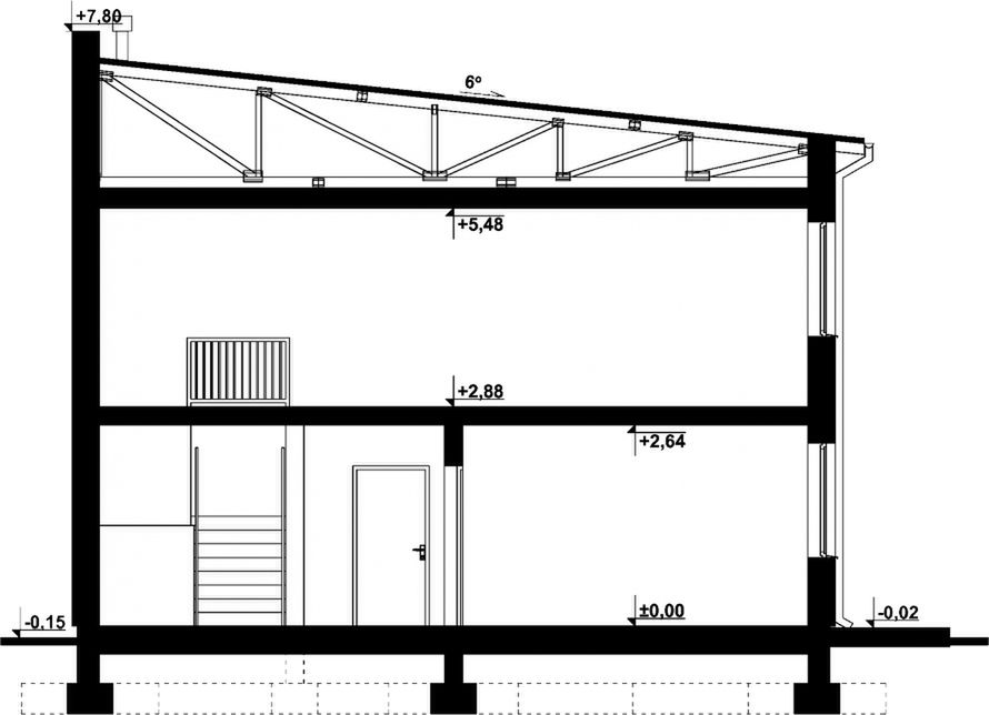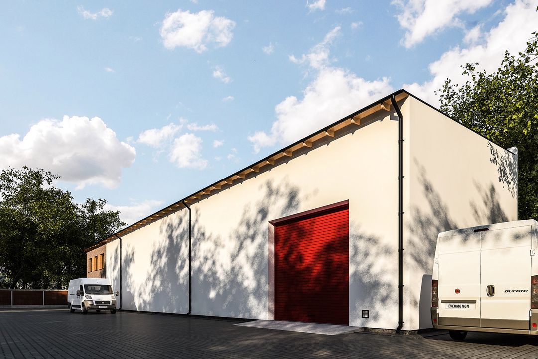 Budynek wykonany w technologii tradycyjnej. Ściany warstwowe grubości 36cm, murowane z bloczków z betonu komórkowego grubości 24cm, ocieplone styropianem grubości 12cm, wewnętrzne z bloczków z betonu komórkowego grubości 24cm i 12cm. Brama o wymiarach 3,00×3,00m. Strop gęstożebrowy „TERIVA 4,0”. Więźba dachowa jednospadowa, drewniana z wiązarów kratowych łączonych płytkami kolczastymi, pokryta blachą trapezową.