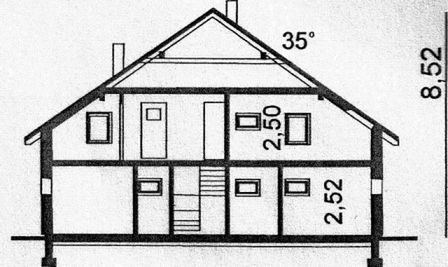 Ściany zewnętrzne: Konstrukcja tradycyjna, ściany murowane z pustaków ALFA i pustaków MAX. Strop: żelbetowy. Dach: dwuspadowy, o kącie nachylenia 35 stopni, kryty blachą trapezową. Poziom kalenicy: 8,82 od terenu