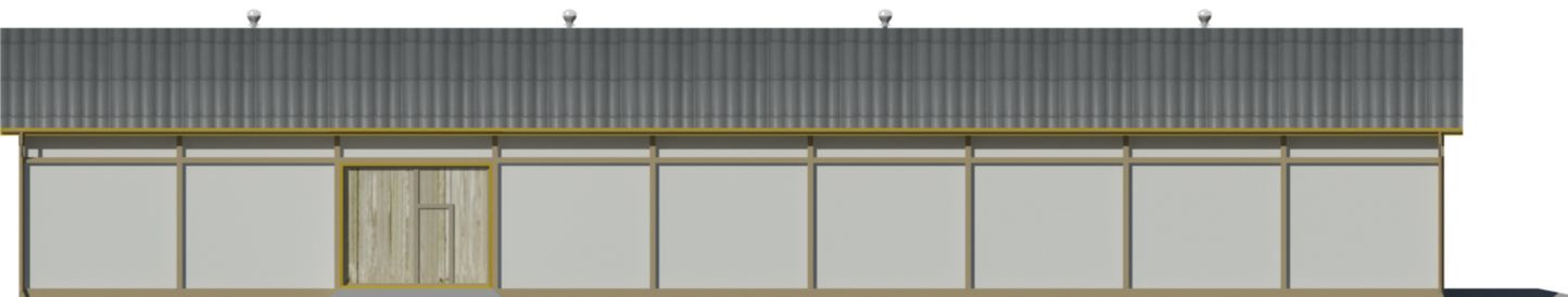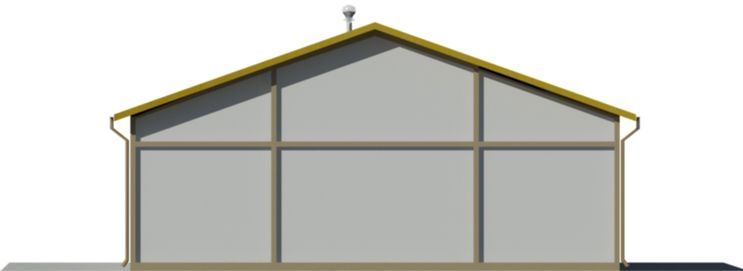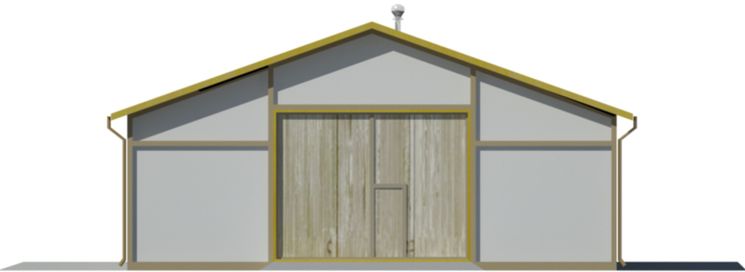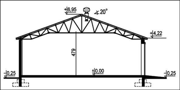 Ściany zewnętrzne: gr. 24 cm, układ słupowo-ryglowy z wypełnieniem ścian pustakami żużlowo-betonowymi. Dach: dwuspadowy o nachyleniu 20 stopni, krycie płytami falistymi EUROFALA. Poziom kalenicy: 7,20 m od terenu. Dodatkowe informacje: W cenie projekt stalowego wiąza kratowego W-105 rozpietość 13,8m