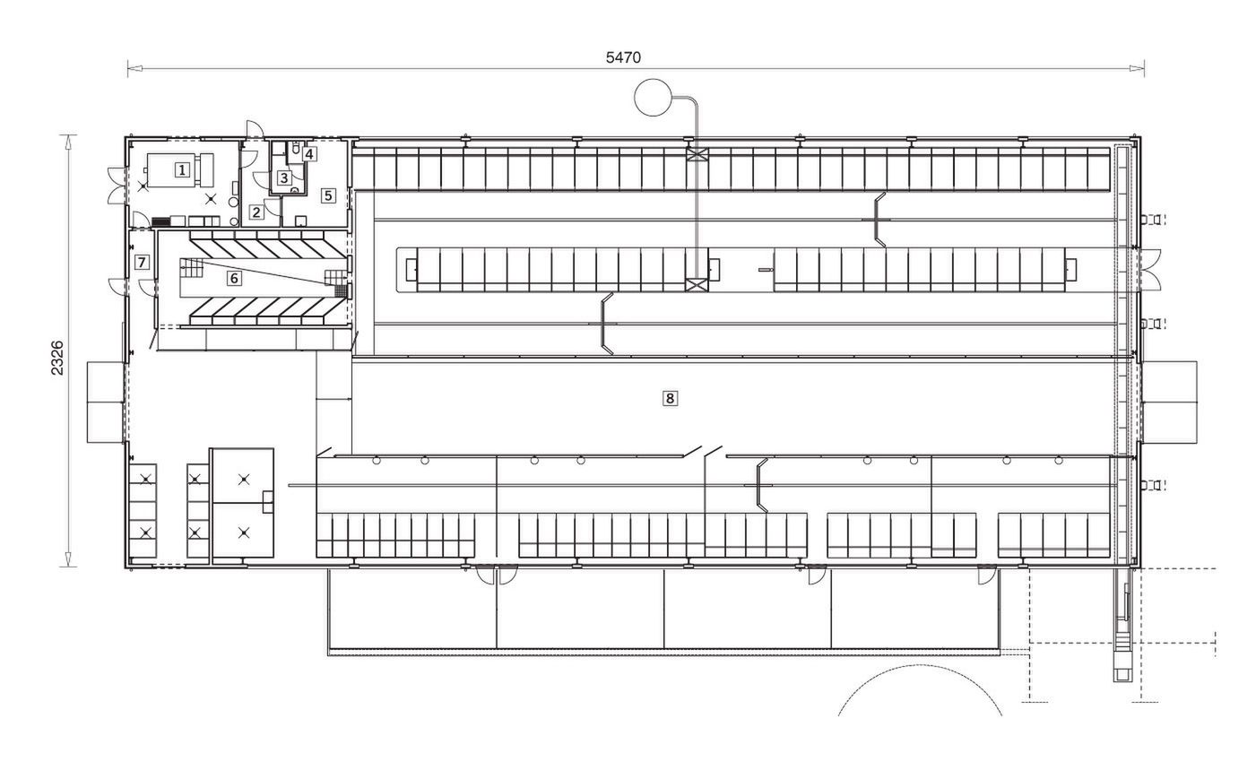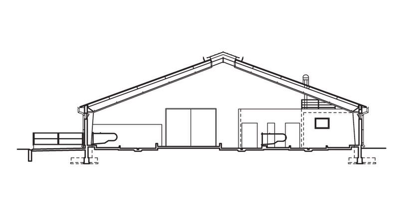 Ściany zewnętrzne:dwuwarstwowe gr. 23 cm pustak wapienno piaskowy drążony. Strop:nad pomieszczeniami nr 1-5 gęstożebrowy typu TERIVA I. Dach: dwuspadowy o stalowej konstrukcji ramowej; pokrycie - stalowa blacha trapezowa powlekana o grubości 1 mm. kąt nachylenia 20° (36%).