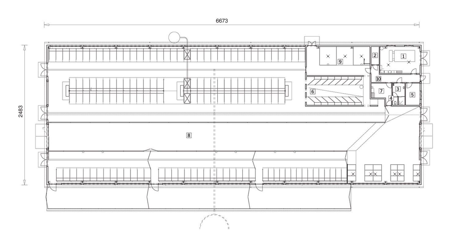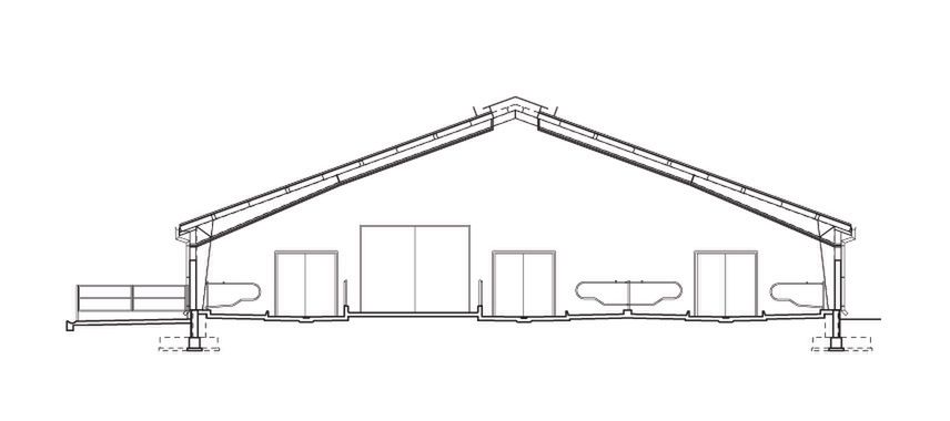 Ściany zewnętrzne: jednowarstwowe gr. 24 cm z gazobetonu. Strop: nad pomieszczeniami nr 1-5, 7, 12 gęstożebrowy typu TERIVA I. Dach: dwuspadowy o stalowej konstrukcji ramowej; pokrycie - stalowa blacha trapezowa powlekana o grubości 1 mm; kąt nachylenia 20° (36%).