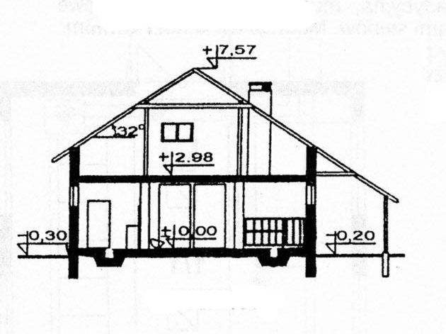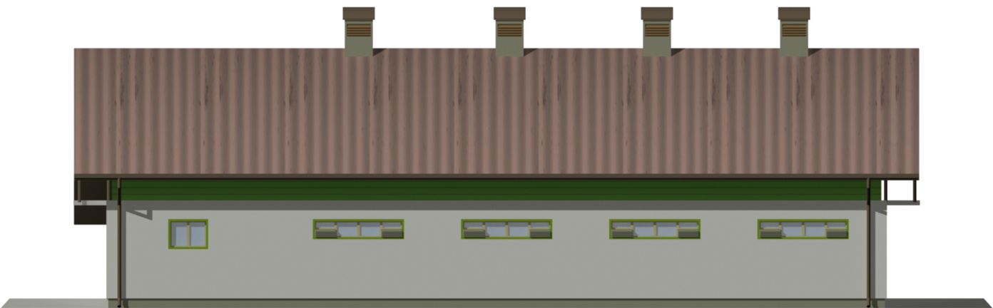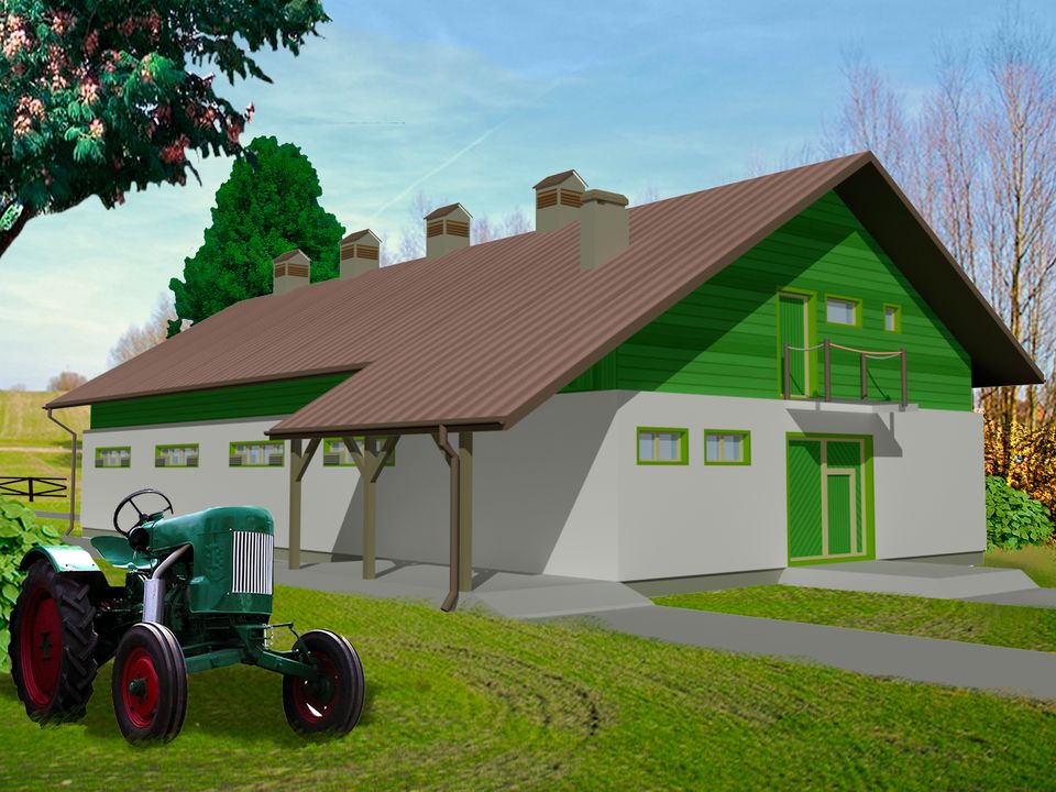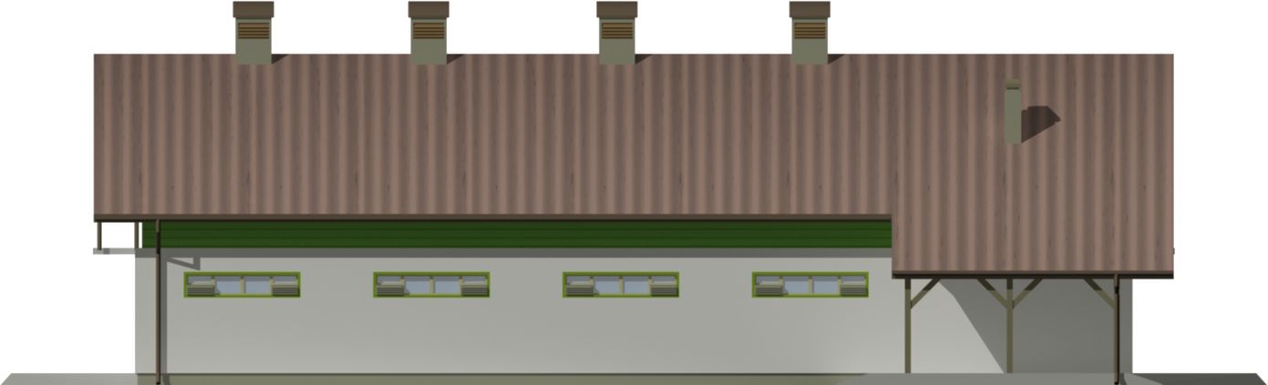 Ściany zewnętrzne: Konstrukcja tradycyjna, murowane ściany warstwowe z dwoma rzędami słupów. Moduł podłużny 3,90 - 4,50 m rozstaw osiowy poprzeczny 3,30 - 3,90 - 3,30 m.. Strop: KLEINA lub żelbet. Dach: dwuspadowy o nachyleniu 32 stopnie. Więźba dachowa drewniana. Przedłużona postać dachu tworzy wiatę alt. magazyn pasz.. Poziom kalenicy: 7,87 od terenu. Dodatkowe informacje: Segmentowa budowa umożliwia realizację obór dłuższych o 4 segmenty lub mniejszych maksymalnie o 2 segmenty. Do obliczeń wentylacji przyjęto obsadę 30,1 DJP