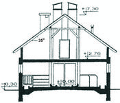Ściany zewnętrzne: Konstrukcja tradycyjna, murowane ściany warstwowe z dwoma rzędami słupów. Moduł podłużny 2,40 - 3,00 - 3,60 m rozstaw osiowy 3 x 3,00 m. Wariantowe rozwiązanie materiałowe ścian i stropów. Więźba dachowa drewniana.. Dach: dwuspadowy o kącie nachylenia 35 stopni. Poziom kalenicy: 7,6 od terenu. Dodatkowe informacje: Hala zwierząt dwurzędowa, centralny korytarz paszowy o szer. 140 cm, system chowu ściołowy, 15 stanowisk wiązanych indywidualnych, 5 kojców zbiorczych. Zmechanizowane pojenie i usuwanie obornika. Obsada 15,5 DJP