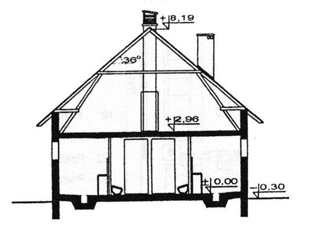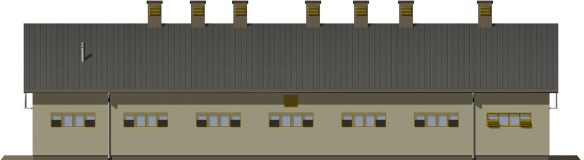 Ściany zewnętrzne: Konstrukcja tradycyjna, murowane ściany warstwowe z dwoma rzędami słupów z rur stalowych o średnicy 160 wypełnionych betonem. Moduł podłużny 4,50 m, rozstaw osiowy poprzeczny 3,30 - 3,90 - 3,30 m. Wariantowe rozwiązanie materiałowe ścian i stropów.. Dach: Dach dwuspadowy o kacie nachylenia 36 stopni, drewniany, jętkowo-kozłowy ze ścianką kolankową, dwuspadowy. Alternatywnie dach płatwiowo-kleszczowy, dwustolcowy. Pokrycie dachu blachą fałdową stalową lub dachówką zakładkową.. Poziom kalenicy: 8,49 od terenu. Dodatkowe informacje: Obsada 40 DJP. Segmentowa budowa umożliwia realizację obór dłuższych o 5 segmentów lub mniejszych maksymalnie o 3 segmenty.