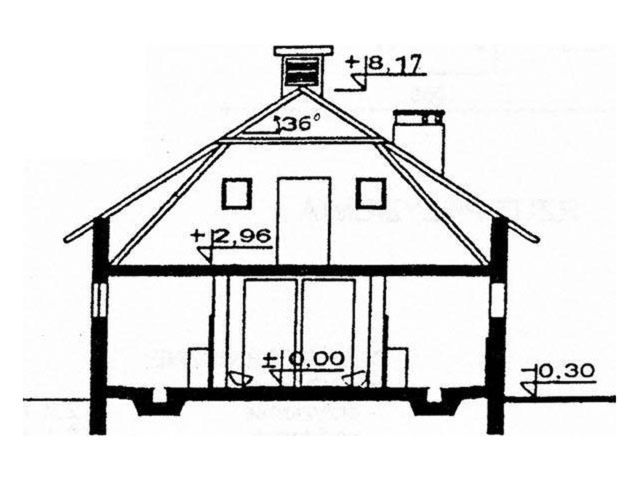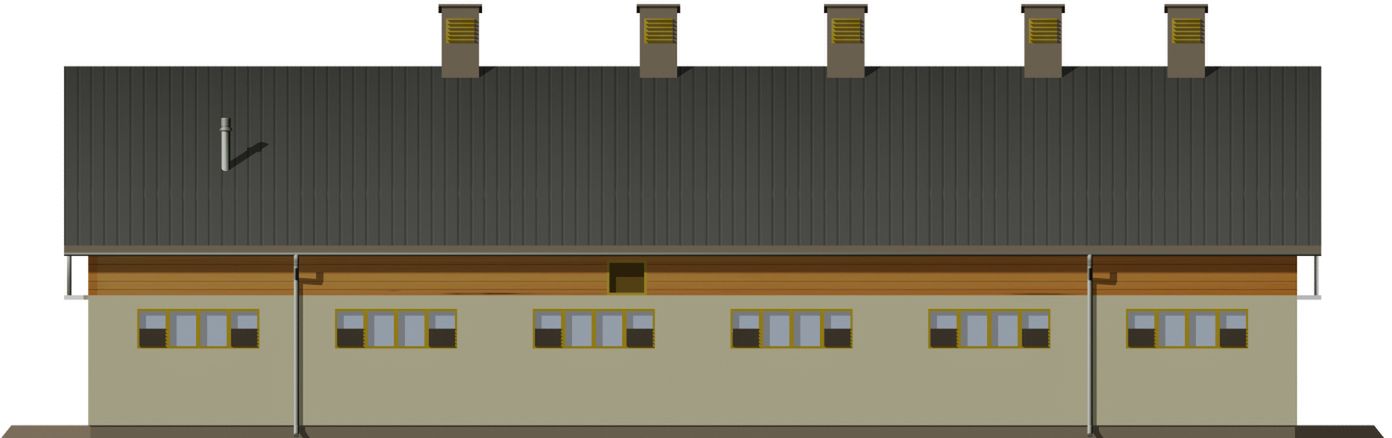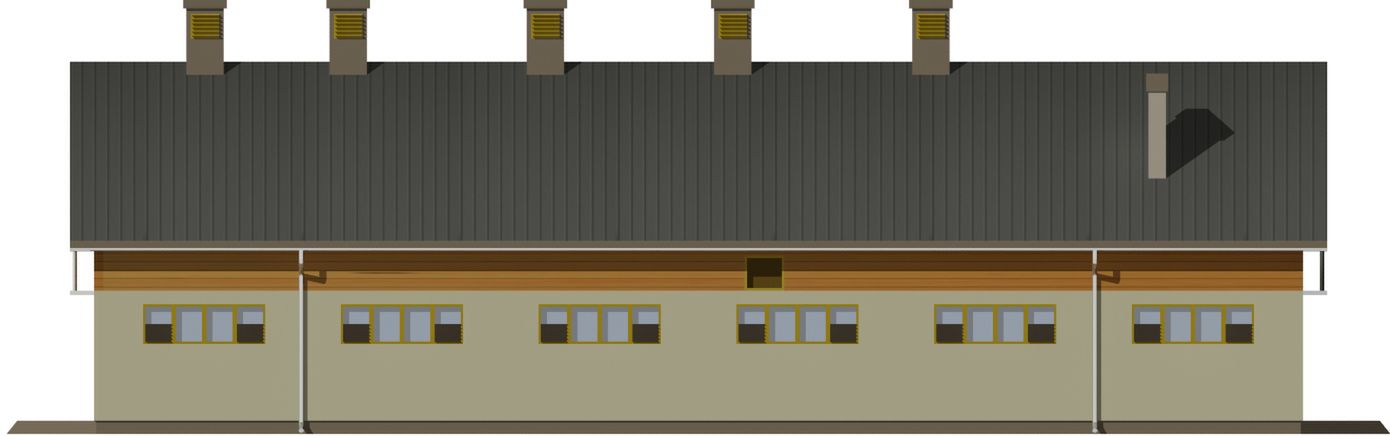 Ściany zewnętrzne: Konstrukcja tradycyjna, murowane ściany warstwowe z dwoma rzędami słupów. Moduł podłużny 4,50 m, rozstaw osiowy poprzeczny 3,60 - 3,90 - 3,60 m. Wariantowe rozwiązanie materiałowe ścian i stropów.. Dach: dwuspadowy o kacie nachylenia 36 stopni. Więźba dachowa drewniana.. Poziom kalenicy: 8,47 od terenu. Dodatkowe informacje: Stanowiska ściołowe, wiązane krótkie, układ dwurzędowy, centralny korytarz paszowy przejazdowy dla ciągnika. Obsada 33,20 DJP