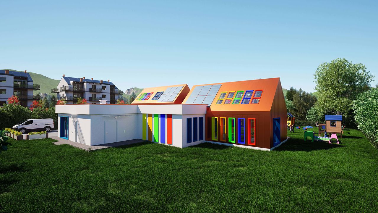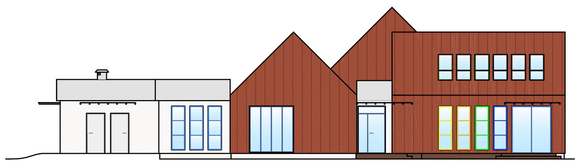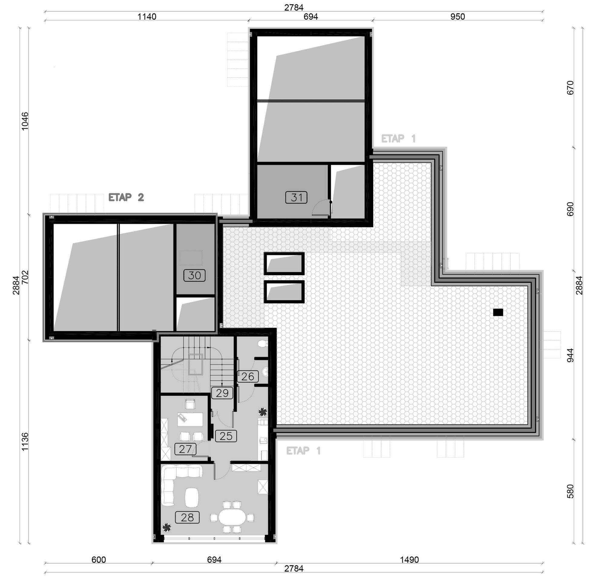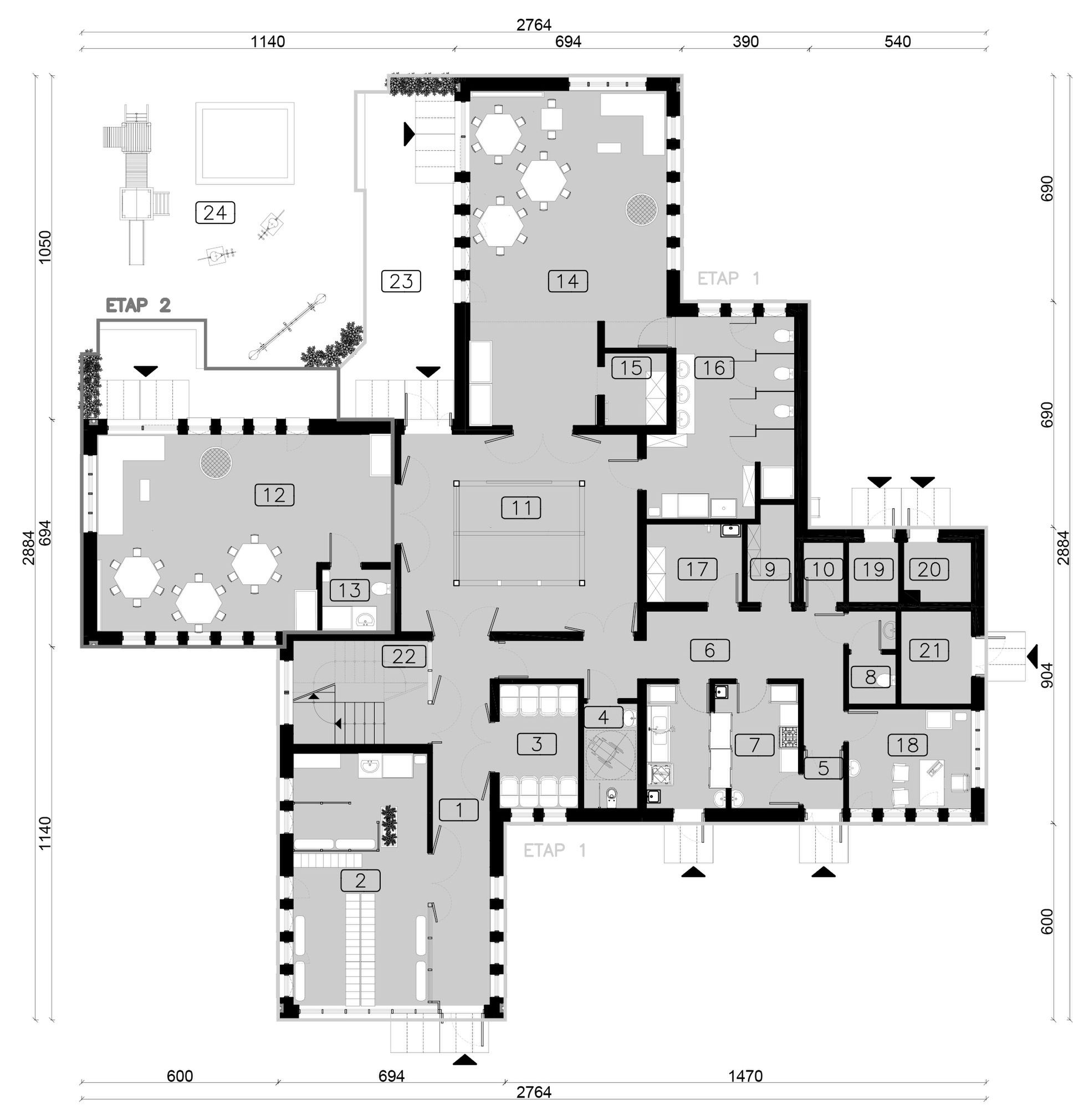 Klasa betonu: C25/30 {B30); Stal zbrojeniowa: B500B - średnica - 8 / 10 / 12 mm; Elementy drewniane: C24; Elementy stalowe: S235; Ściany murowane: Silikat E24 kl. 20; Strop: płyta żelbetowa; Dach: 3 dachy strome, dwuspadowe o kącie nachylenia krokwi równym 45°, więźba drewniana; pokrycie dachów stromych: panele dachowe na rąbek, poliester matowy PMG R750 dach płaski, na płycie żelbetowej, z murowaną attyką z bloczków silikatowych E24, kl. 20, gr. 24 cm i wysokości 77cm; pokrycie dachu płaskiego: papa w kolorze czerwonym