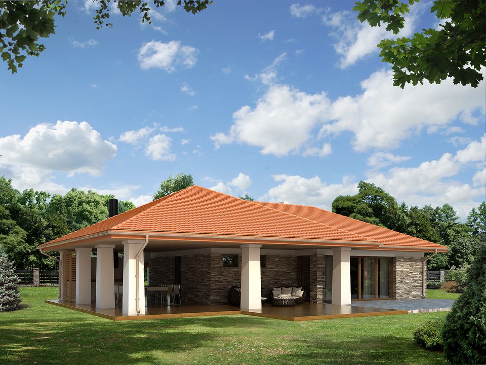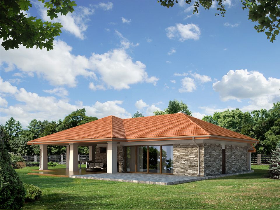 Graficzne opracowanie rzutów poglądowych widocznych na karcie projektu zostało wykonane przez Extradom.pl. Prezentowane przez Extradom.pl wizualizacje wykonane zostały przez autora projektu i należy poczytywać je jedynie za przykład i propozycję wykończenia, wizję architektoniczną autora projektu. Ostateczne wykończenie budynku może nastąpić na wiele sposobów. Szczegółowe rozwiązania zastosowane w oferowanej dokumentacji - w tym również ilość, lokalizacje i wygląd okien, drzwi, kominów - mogą w niewielkim stopniu różnić się od prezentowanej wizualizacji budynku.