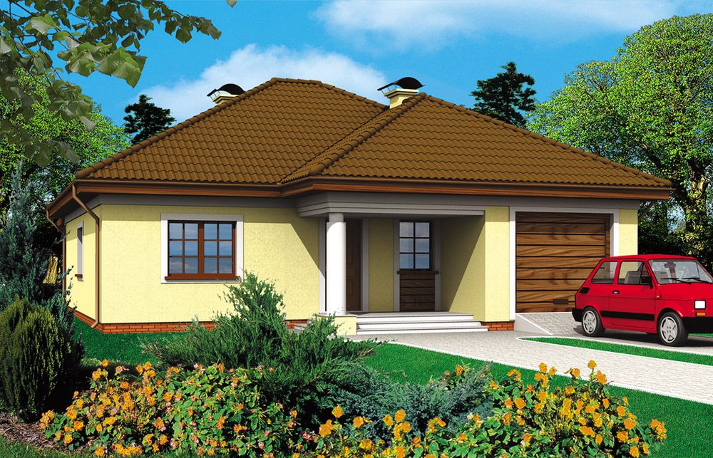 Ściany zewnętrzne: murowane, dwuwarstwowe. Strop: TERIVA. Elewacje: tynk mineralny. Pokrycie dachu: dachówka ceramiczna lub blachodachówka.