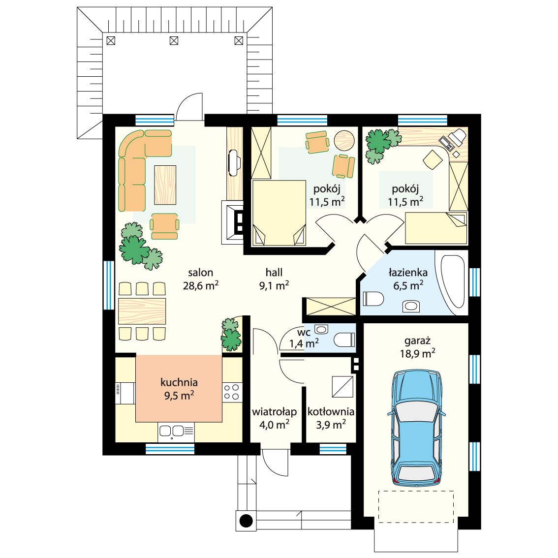 Graficzne opracowanie rzutów poglądowych widocznych na karcie projektu zostało wykonane przez Extradom.pl. Prezentowane przez Extradom.pl wizualizacje wykonane zostały przez autora projektu i należy poczytywać je jedynie za przykład i propozycję wykończenia, wizję architektoniczną autora projektu. Ostateczne wykończenie budynku może nastąpić na wiele sposobów. Szczegółowe rozwiązania zastosowane w oferowanej dokumentacji - w tym również ilość, lokalizacje i wygląd okien, drzwi, kominów - mogą w niewielkim stopniu różnić się od prezentowanej wizualizacji budynku.