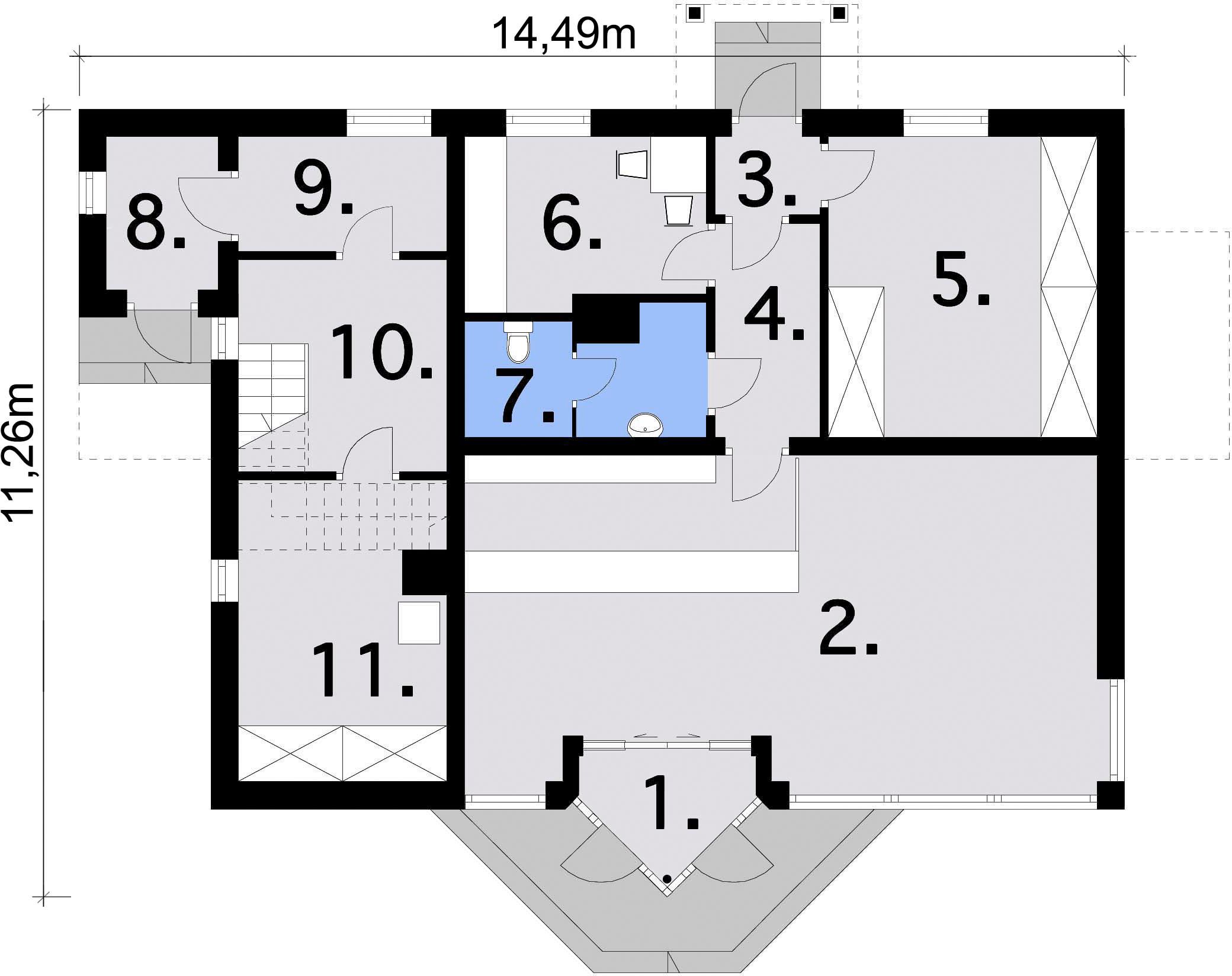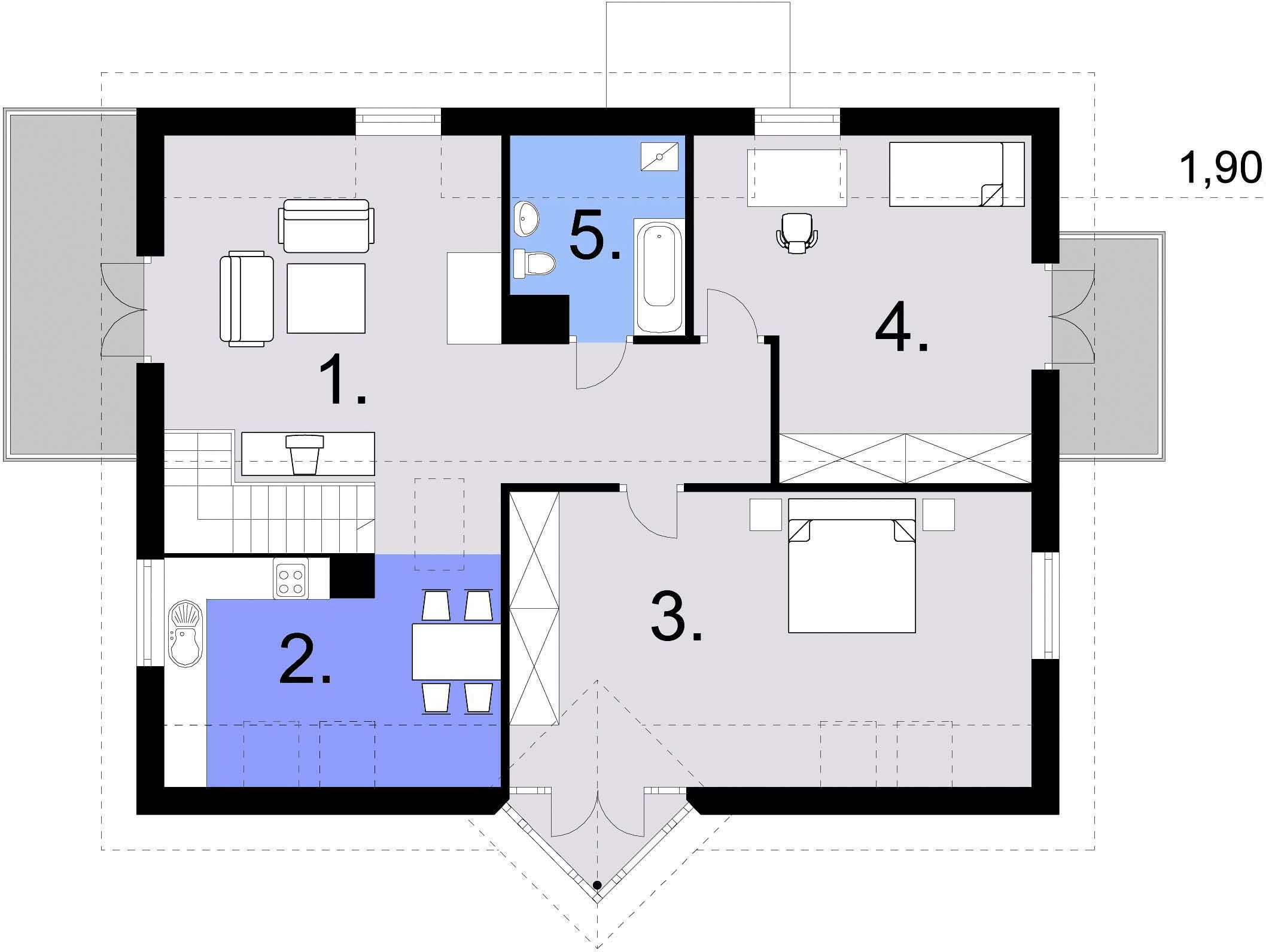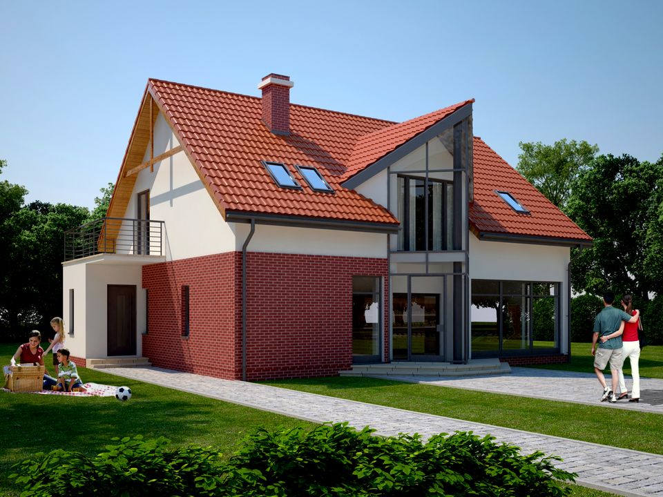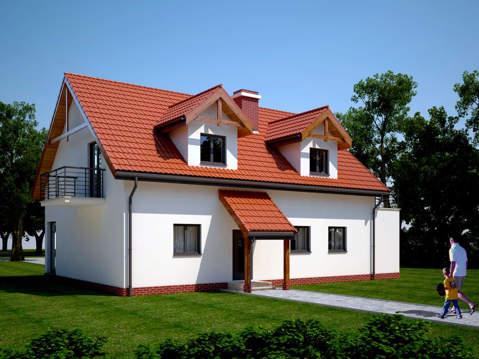 Graficzne opracowanie rzutów poglądowych widocznych na karcie projektu zostało wykonane przez Extradom.pl. Prezentowane przez Extradom.pl wizualizacje wykonane zostały przez autora projektu i należy poczytywać je jedynie za przykład i propozycję wykończenia, wizję architektoniczną autora projektu. Ostateczne wykończenie budynku może nastąpić na wiele sposobów. Szczegółowe rozwiązania zastosowane w oferowanej dokumentacji - w tym również ilość, lokalizacje i wygląd okien, drzwi, kominów - mogą w niewielkim stopniu różnić się od prezentowanej wizualizacji budynku.