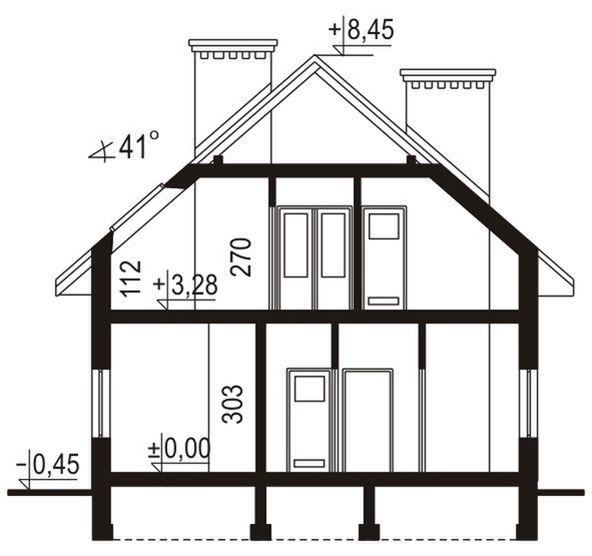 Ściany zewnętrzne: gr.36,5cm; bloczki YTONG EnergoUltra+PP2,2/,03. Strop: żelbetowy. Schody: żelbetowe. Dach: dwuspadowy o nachyleniu 41 stopni, kryty dachówką. Poziom kalenicy: 8,80 m od terenu. Dodatkowe informacje: ogrzewanie: kocioł gazowy jednofunkcyjny z zasobnikiem c.w.u..