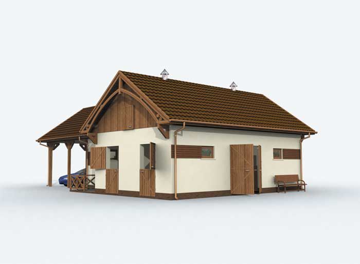 Technologia tradycyjna : - szerokość komunikacji : 2,75m - wymiary boksów: 3,0m x 3,5m - wymiary wrot drewnianych 2,5m x 2,5m - ściany zewnętrzne murowane grubości 25 cm. - ściany wewnętrzne działowe murowane grubości 12 cm. - wszystkie ściany wykonane z pustaków ceramicznych "POROTHERM". - dach wielospadowy o kącie 35° - dach pokryty dachówką ceramiczną. - konstrukcja więźby dachowej drewniana - pow. dachu : 205m2 - w łazience zastosowano przepływowy podgrzewacz wody umywalkowo natryskowy. Orientacyjny koszt inwestycji (technologia tradycyjna):