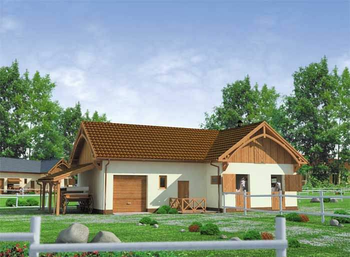 Technologia tradycyjna : - wymiary boksów: 3,0m x 3,5m - wymiary wrot drewnianych 2,5m x 2,5m - wymiary bramy garażowej 2,4m x 2,4m - ściany zewnętrzne murowane grubości 25 cm. - ściany wewnętrzne działowe murowane grubości 12 cm. - wszystkie ściany wykonane z pustaków ceramicznych "POROTHERM". - dach wielospadowy o kącie 35 , 20° - dach pokryty dachówką ceramiczną. - konstrukcja więźby dachowej drewniana - pow. dachu : 190,50m2 - w łazience zastosowano przepływowy podgrzewacz wody umywalkowo natryskowy