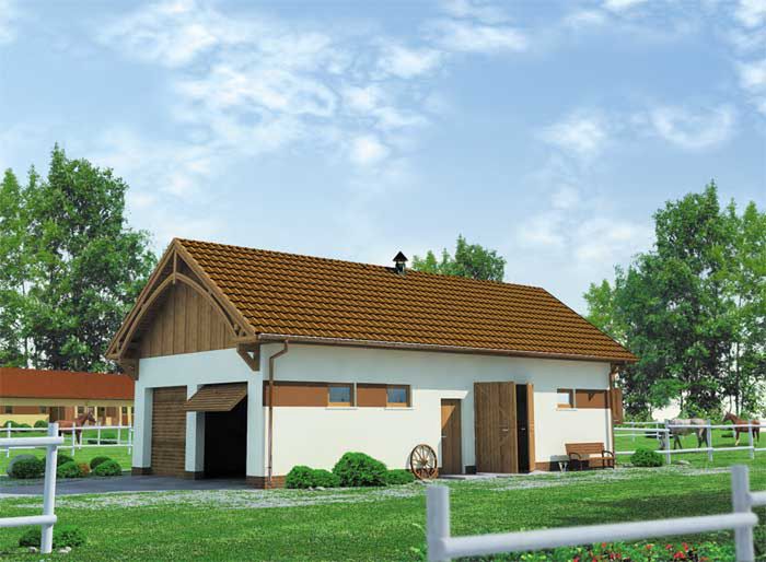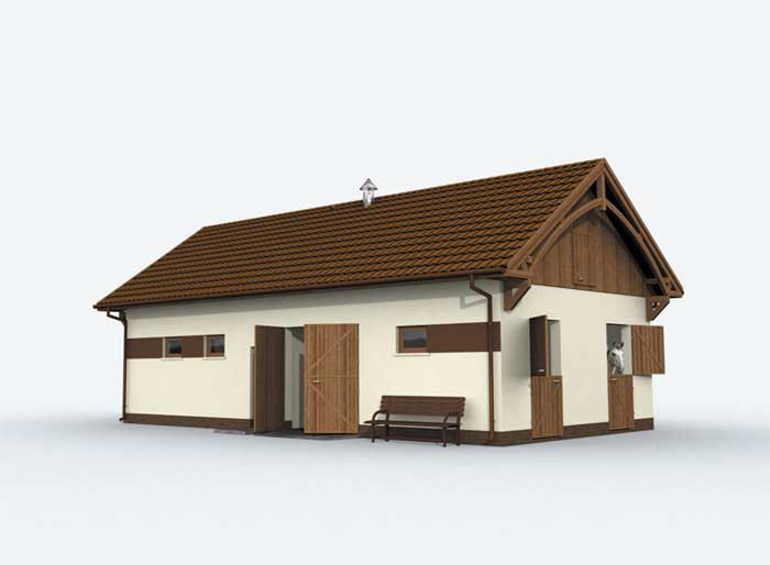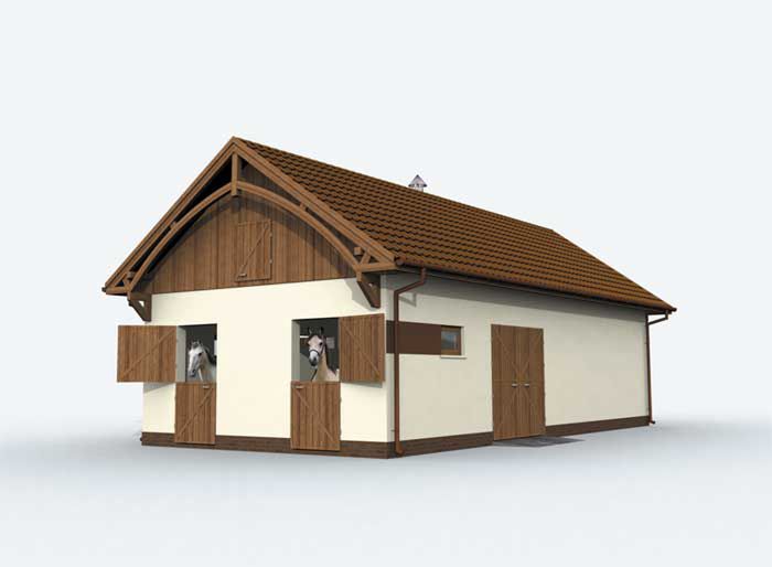 Technologia tradycyjna : - szerokość komunikacji : 2,8m - wymiary boksów: 3,0m x 3,5m - wymiary wrot drewnianych 2,5m x 2,5m - wymiar bram garażowych 2,4m x 2,4m - ściany zewnętrzne murowane grubości 25 cm. - wszystkie ściany wykonane z pustaków ceramicznych "POROTHERM". - dach dwuspadowy o kącie 35° - dach pokryty dachówką ceramiczną. - konstrukcja więźby dachowej drewniana - pow. dachu : 139m2