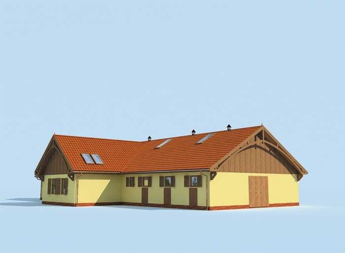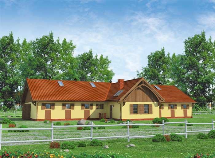 Technologia tradycyjna : - szerokość komunikacji : 2,8m - wymiary boksów: 3,0m x 3,5m, 4m x 4m - wymiary wrot drewnianych 2,5m x 2,5m - ściany zewnętrzne murowane grubości 25 cm. część mieszkalna 30cm + 10cm styropian - ściany wewnętrzne działowe murowane grubości 12 cm. - wszystkie ściany wykonane z pustaków ceramicznych "POROTHERM". - dach wielospadowy o kącie 30, 40, 15° - dach pokryty dachówką ceramiczną. - konstrukcja więźby dachowej drewniana, płatwiowo-kleszczowa - projekt dosiada kominek - w łazience zastosowano przepływowy podgrzewacz wody umywalkowo natryskowy.