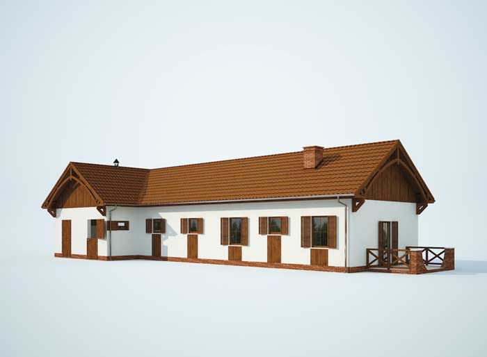 Graficzne opracowanie rzutów poglądowych widocznych na karcie projektu zostało wykonane przez Extradom.pl. Prezentowane przez Extradom.pl wizualizacje wykonane zostały przez autora projektu i należy poczytywać je jedynie za przykład i propozycję wykończenia, wizję architektoniczną autora projektu. Ostateczne wykończenie budynku może nastąpić na wiele sposobów. Szczegółowe rozwiązania zastosowane w oferowanej dokumentacji - w tym również ilość, lokalizacje i wygląd okien, drzwi, kominów - mogą w niewielkim stopniu różnić się od prezentowanej wizualizacji budynku.
