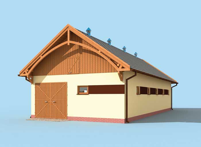 Technologia tradycyjna : - wymiary wrot drewnianych 3,0m x 2,8m, - wymiar drzwi drewniane dwudzielne otwierane na 180° 2,0 x 2,0m - ściany zewnętrzne murowane grubości 25 cm. - ściany działowe grubości 12cm - wszystkie ściany wykonane z pustaków ceramicznych "POROTHERM". - strop z belek drewnianych - dach dwuspadowy o kącie 35° - dach pokryty dachówką ceramiczną. - konstrukcja więźby dachowej drewniana - pow. dachu : 203m2