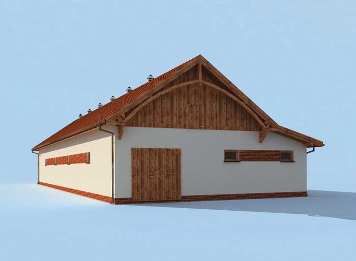Technologia tradycyjna : - wymiary wrot drewnianych 2,5m x 2,5m, - wymiar drzwi drewniane dwudzielne otwierane na 180° 1,2 x 2,5m - ściany zewnętrzne murowane grubości 25 cm. - ściany działowe grubości 12cm - wszystkie ściany wykonane z pustaków ceramicznych "POROTHERM". - strop z belek drewnianych - dach dwuspadowy o kącie 35, 15° - dach pokryty dachówką ceramiczną. - konstrukcja więźby dachowej drewniana w układzie krokwiowo-jętkowym - pow. dachu : 435m2