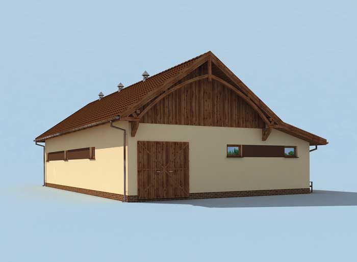 Technologia tradycyjna : - wymiary wrot drewnianych 3,0m x 2,8m, - wymiar drzwi drewniane dwudzielne otwierane na 180° 1,2 x 2,5m - ściany zewnętrzne murowane grubości 25 cm. - ściany nośne 25cm, działowe grubości 12cm - wszystkie ściany wykonane z pustaków ceramicznych "POROTHERM". - dach dwuspadowy o kącie 35, 15° - dach pokryty dachówką ceramiczną. - konstrukcja więźby dachowej drewniana - pow. dachu : 240m2