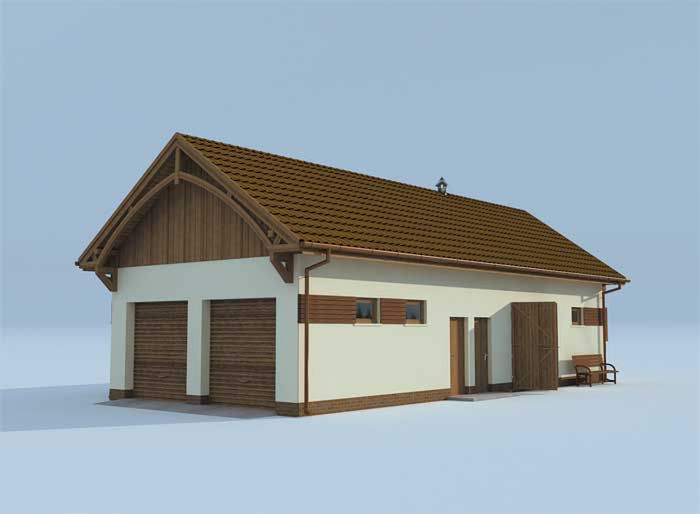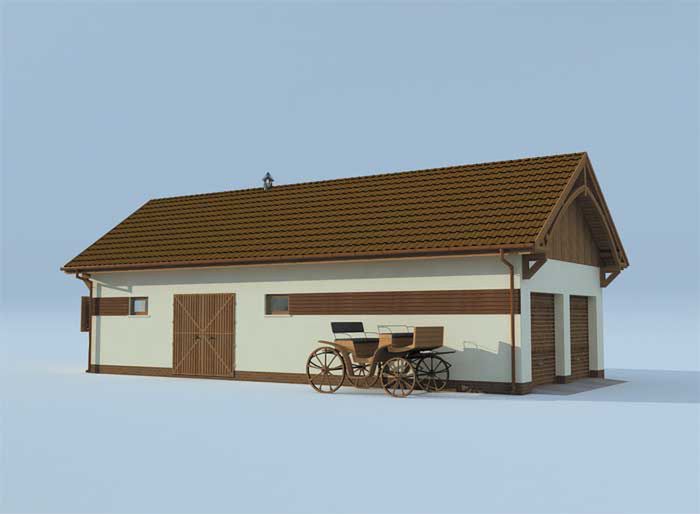 Technologia tradycyjna : - szerokość komunikacji : 2,8m - wymiary boksów: 3,0m x 3,5m - wymiary wrot drewnianych 2,5m x 2,5m - wymiary bramy garażowej 2,4 x 2,4 m - ściany zewnętrzne murowane grubości 25 cm. - ściany wewnętrzne działowe murowane grubości 12 cm. - wszystkie ściany wykonane z pustaków ceramicznych "POROTHERM". - dach dwuspadowy o kącie 35° - dach pokryty dachówką ceramiczną. - konstrukcja więźby dachowej drewnianej - pow. dachu : 157m2 - w łazience zastosowano przepływowy podgrzewacz wody umywalkowo natryskowy.