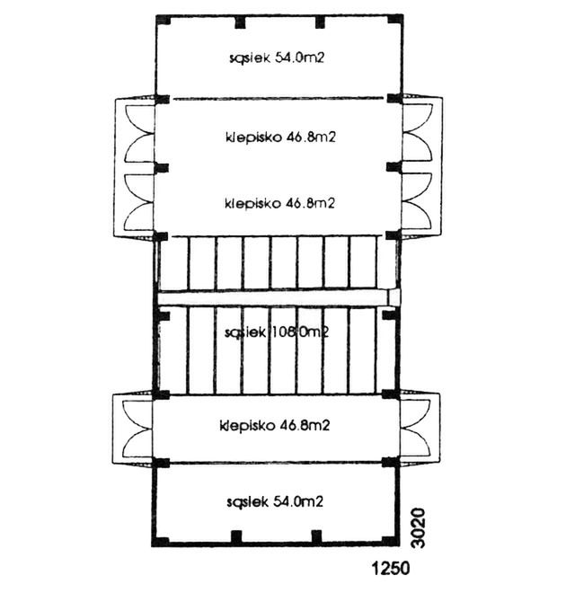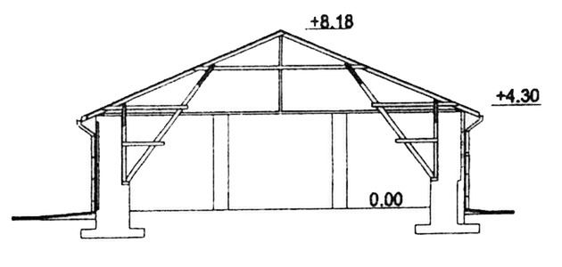 Ściany zewnętrzne: Budynek o konstrukcji szkieletowej, ściany z cegły pełnej.. Dach: Dwuspadowy, o kącie nachylenia 30 stopni. Więźba drewniana, krycie dachówką lub blachą falistą.. Poziom kalenicy: 8,18 m od terenu. Dodatkowe informacje: Alternatywnie podpiwniczenie skrajnego sąsieka, strop nad piwnicą żelbetowy.
