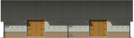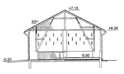 Ściany zewnętrzne: Konstrucji szkieletowej - słupy żelbetowe. ściany z cegły pełnej.. Dach: dwuspadowy, o kacie nachylenia 30 stopni. Więźba dachowa drewniana. Krycie dachówką lub blachą trapezową. Poziom kalenicy: 7,35 m, od terenu. Dodatkowe informacje: Budynek o układzie segmentowym - moduł konstrukcyjny 4,50 m. Alternatywnie pod jednym ze skrajnych sąsieków zaprojektowano piwnice na okopowe.