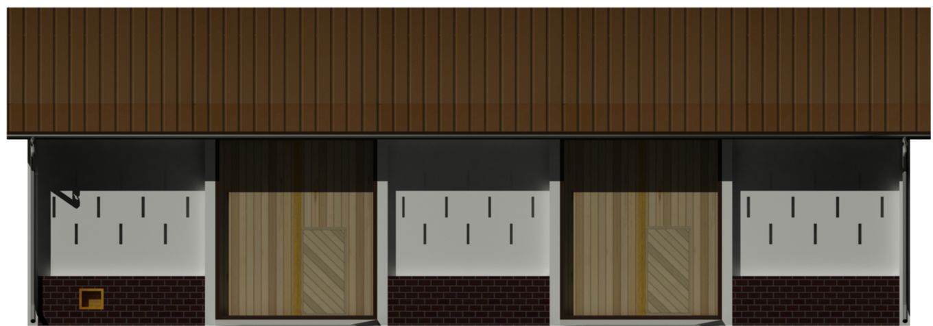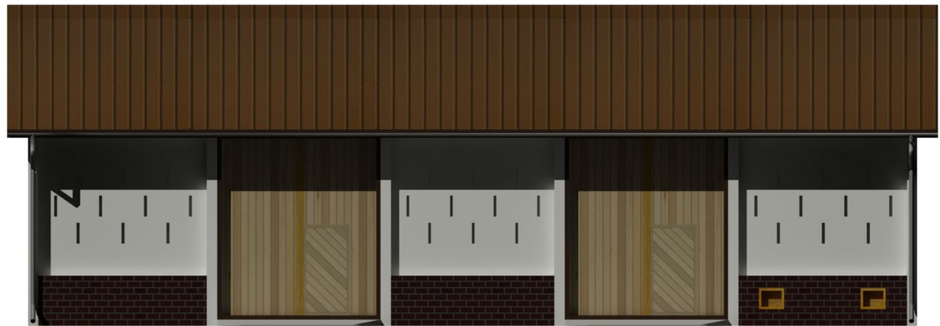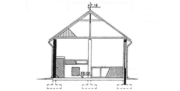 Ściany zewnętrzne: Konstrukcja szkieletowa. Słupy żelbetowe. Pod słupami stopy żelbetowe. Pod ścianami ławy betonowe. Ściany murowane. Ściany szczytowe z desek.. Strop: żelbetowy nad skrajnym podpiwniczonym sąsiekiem.. Dach: dwuspadowy o kącie nachylenia 33 stopni. Więźba dachowa drewniana. Krycie płyty ONDULINE lub blacha trapezowa. Poziom kalenicy: 7,28 m od terenu. Dodatkowe informacje: możliwość rozbudowy segmentowej, lub skrócenia budynku. Długość segmentu 4,20 m. Wyposażenie w instalacje elektryczne, odgromowe i przeciwporażeniowa, wentylacja naturalna.