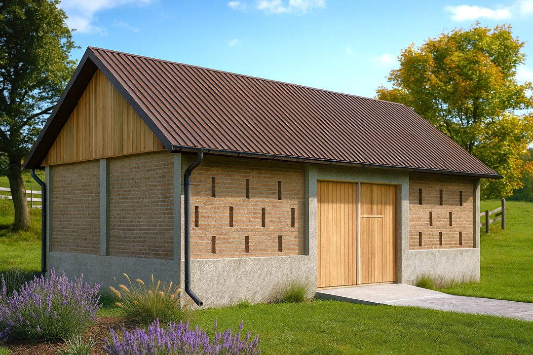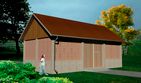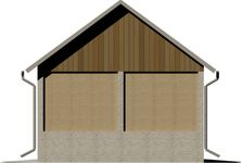 Ściany zewnętrzne: Konstrukcja szkieletowa, ściany murowane z cegły pełnej, trójkątne szczytowe z desek.. Dach: Więżba dachowa drewniana, krycie płyty ONDULINE lub blacha trapezowa. Nachylenie 35 stopni. Poziom kalenicy: 7,00 m od terenu
