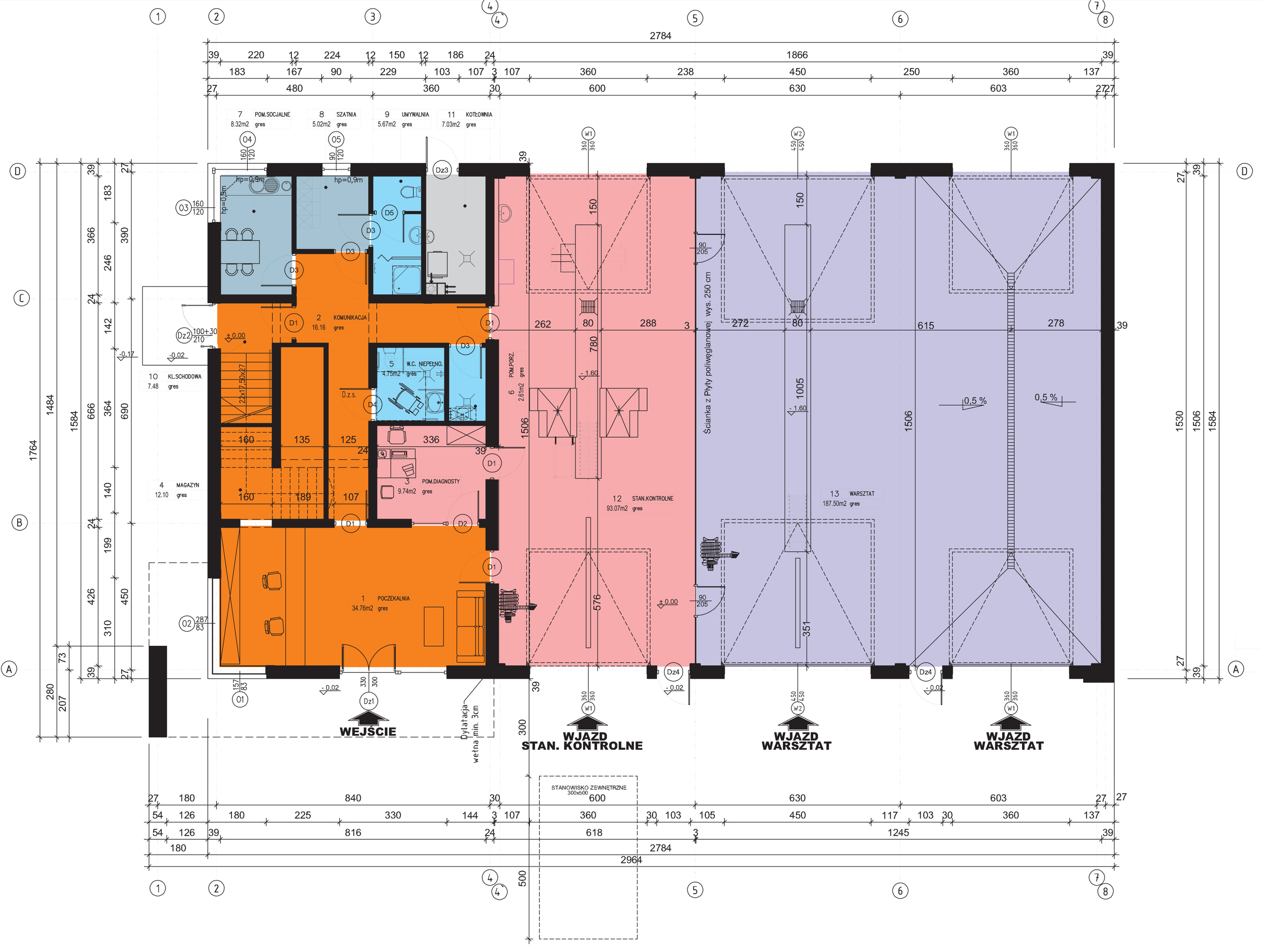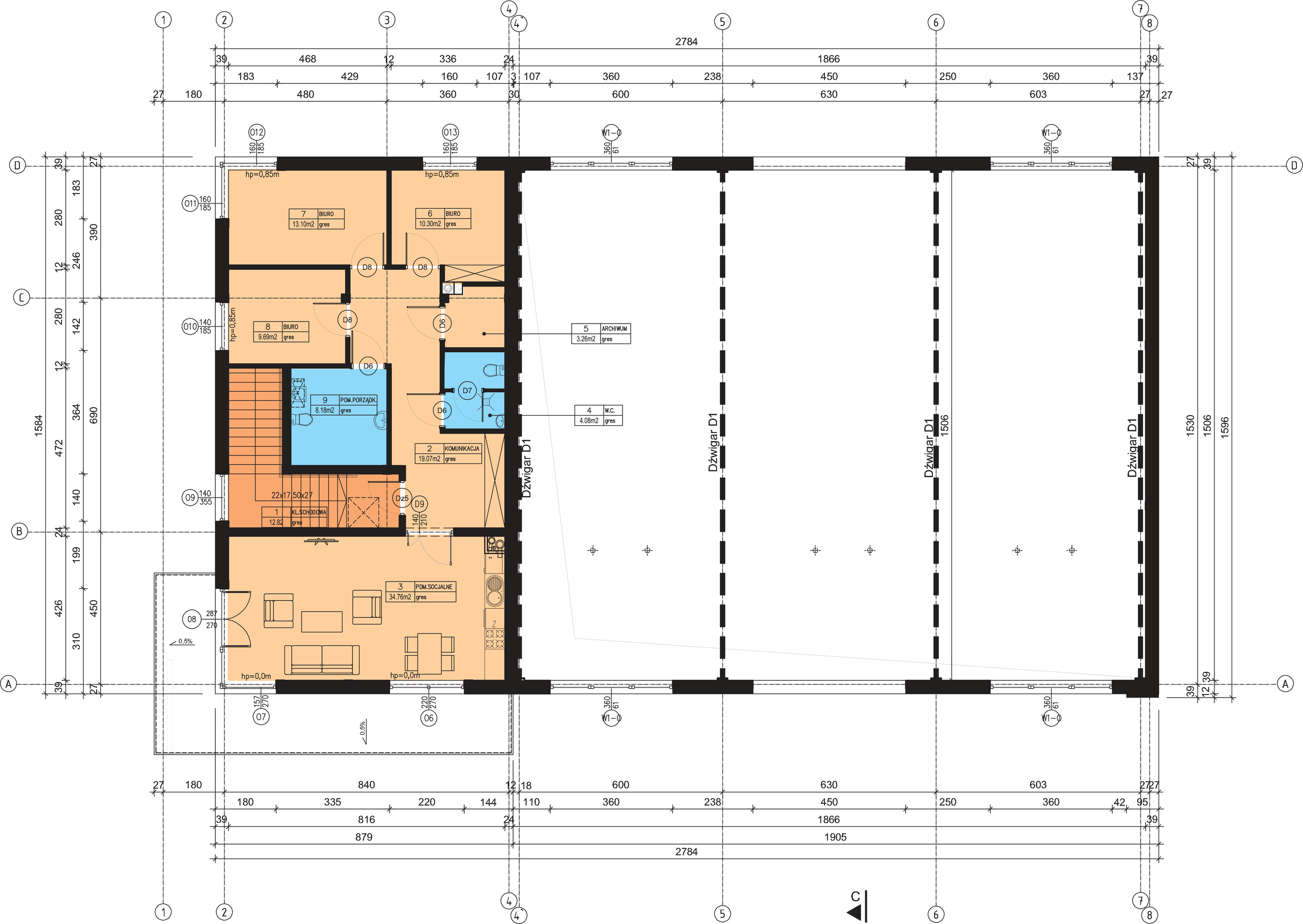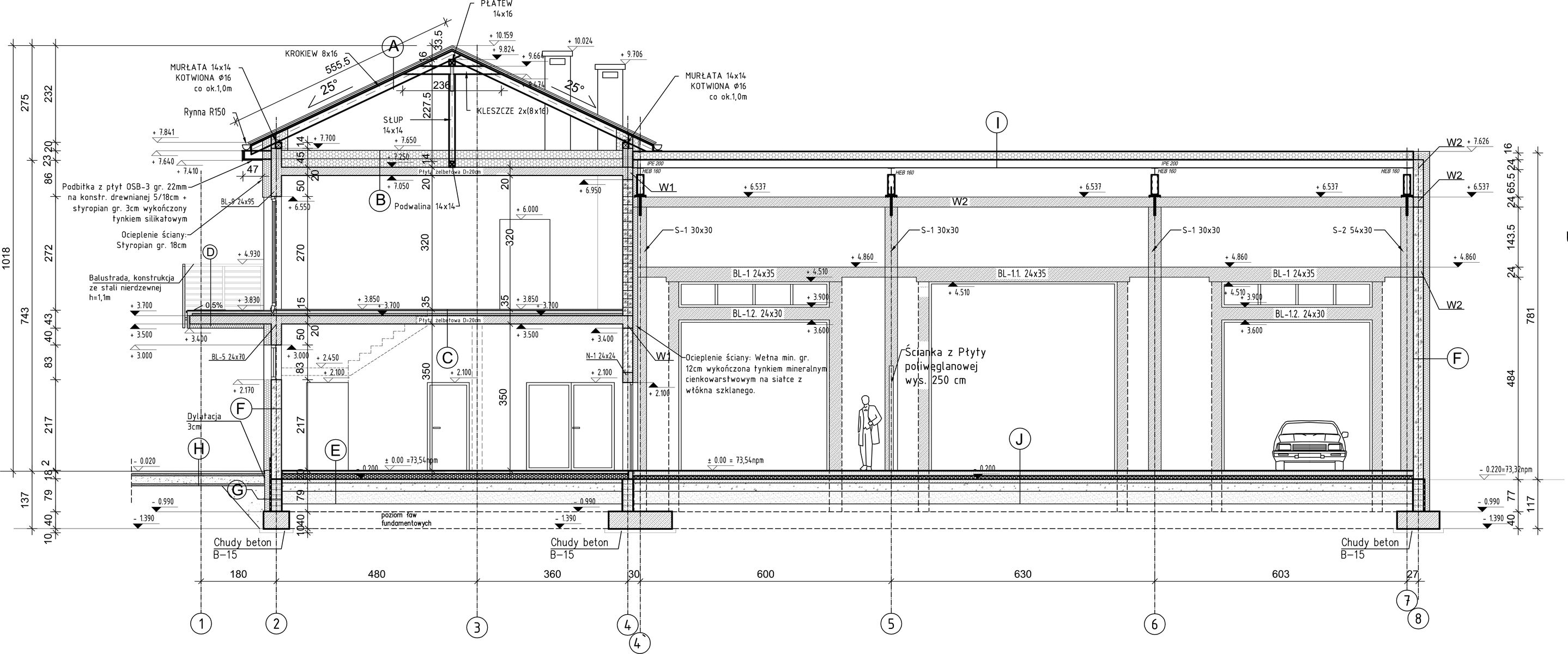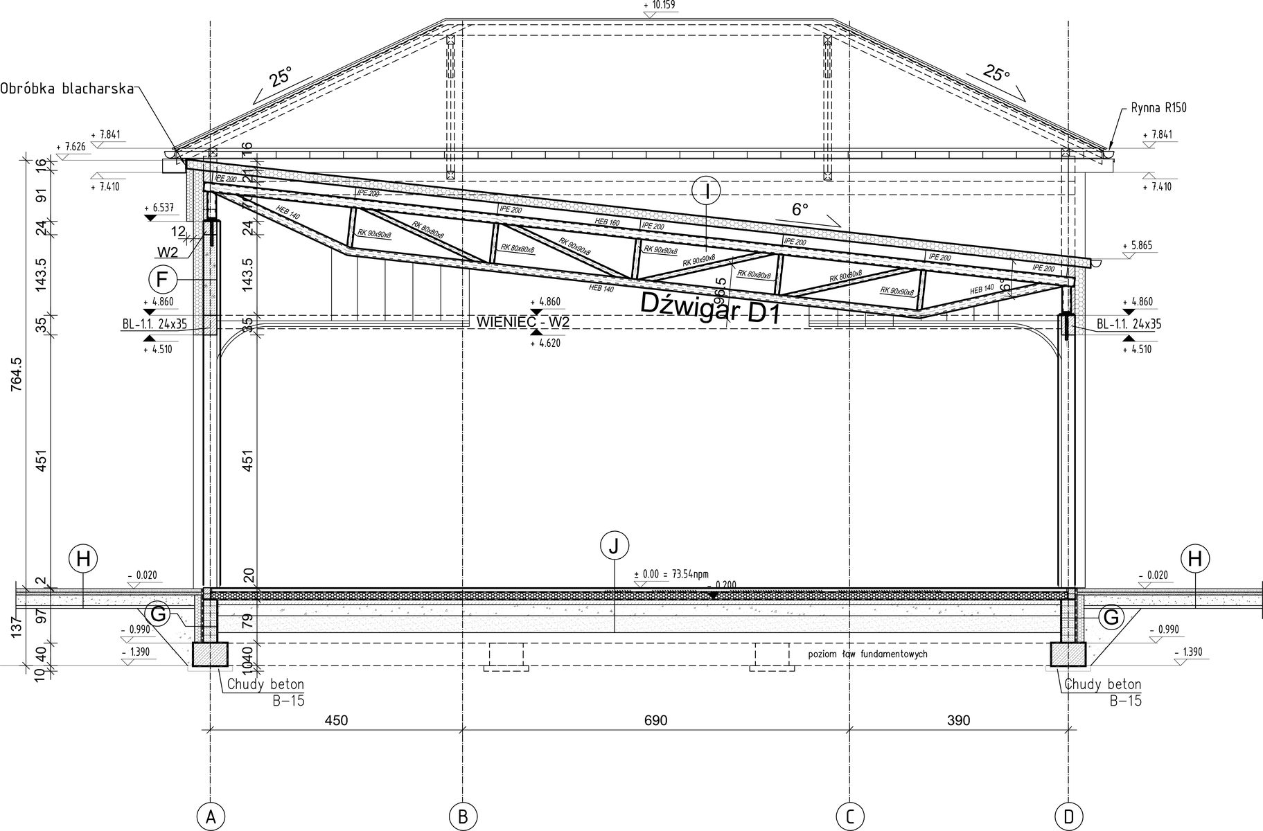 Ściany zewnętrzne: ytong gr. 24cm ocieplone styropianem 15cm. Ściany wewnętrzne: silka 24cm. Strop: żelbetowy monilityczny. Konstrukcja dachu: krokwiowo-płatwiowa, dźwigar stalowy. Dach: blacha płaska na rąbek stojący, blachodachówka. Ogrzewanie: na paliwo ekologiczne.
