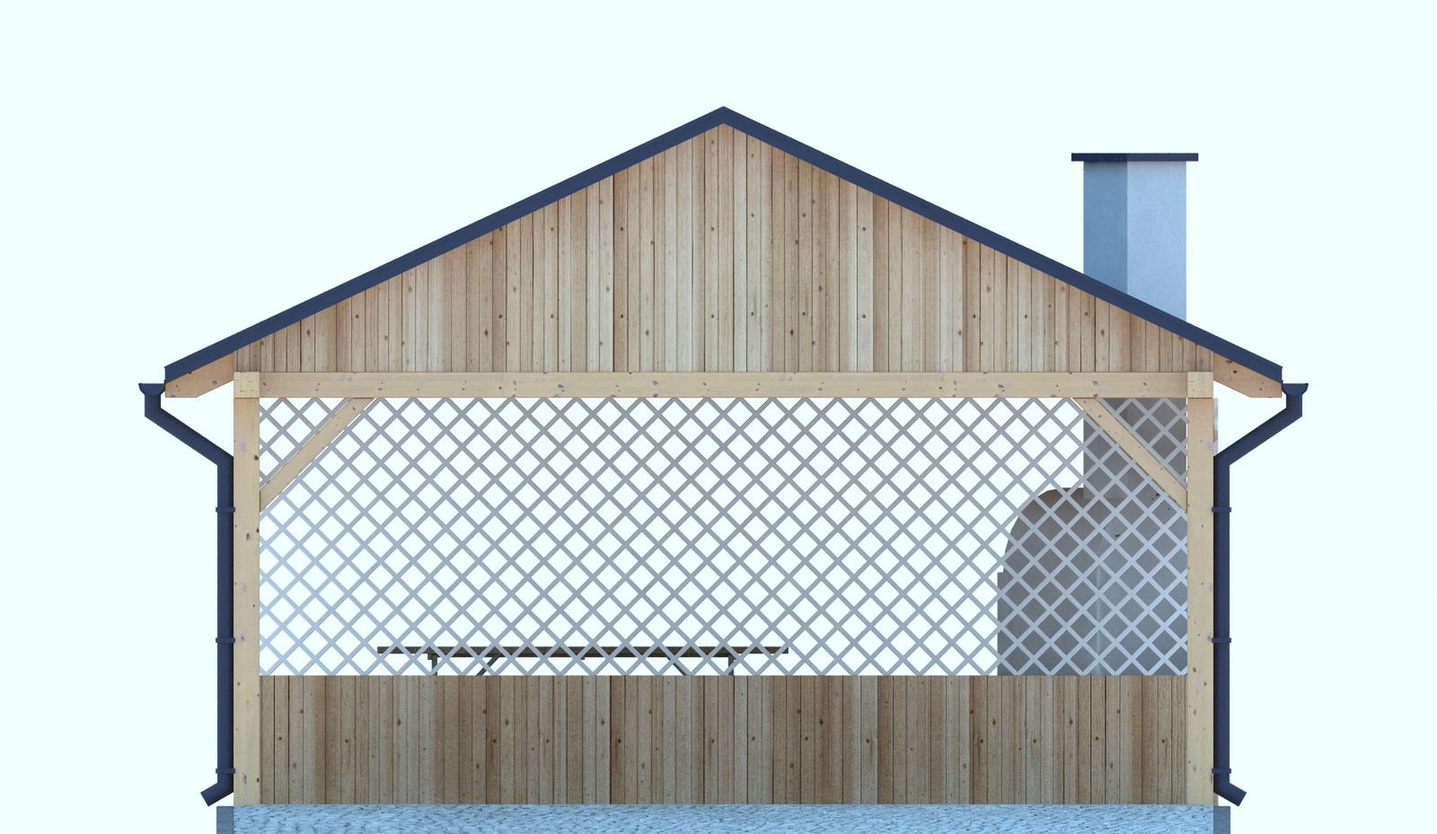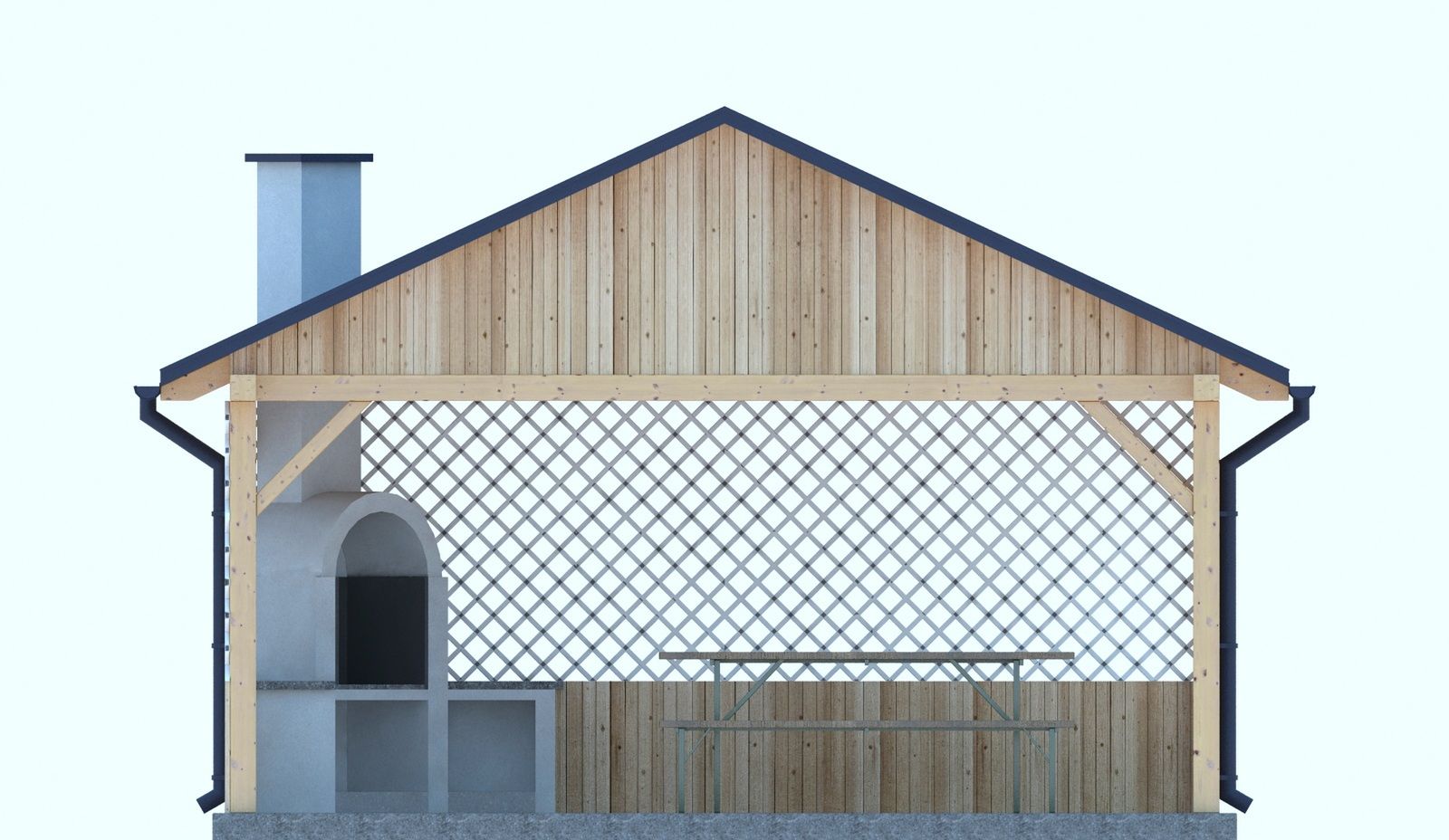 Budynek konstrukcji drewnianej. Ściana drewniana grubości 3,2cm. Grill z cegły ceramicznej pełnej. Więźba dachowa dwuspadowa, drewniana, pokryta blachodachówką.