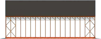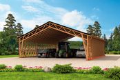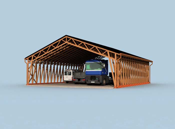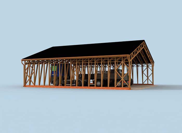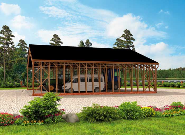 Technologia drewniana. Stopy żelbetowe betonowe zbrojone konstrukcyjnie. Słupy główne zakotwione w fundamencie. Dach dwuspadowy, oparty na dachowych kratownicach, z drewna klasy co najmniej C-24 o wilgotności 22% - pokrycie dachowe papa.