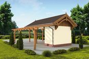 Technologia szkieletowa:- powierzchnia użytkowa (pom. gospodarcze + wiata) - 19,31m2 - powierzchnia użytkowa elementu małej architektury - 19,39 - powierzchnia zabudowy (pom. gospodarcze + wiata) - 21,00m2 - powierzchnia całkowita (pom. gospodarcze + wiata) - 21,00m2 - ściany zewnętrzne: słupki 4x15 rozstawione max. co 40cm obite zewnątrz płytą OSB 3 , a wewnątrz płytą GKF , przestrzeń pomiędzy słupkami wypełniona wełną mineralną 15cm.- wysokość budynku 4m.- dach dwuspadowy 30° - więźba dachowa drewniana, układ krokwiowo-kleszczowy.- pokrycie dachowe : dachówka ceramiczna.Technologia murowana