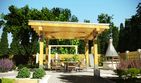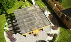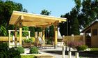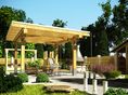 Wiata zaprojektowana w konstrukcji drewnianej, przekryta płaskim dachem z poliwęglanu komorowego.