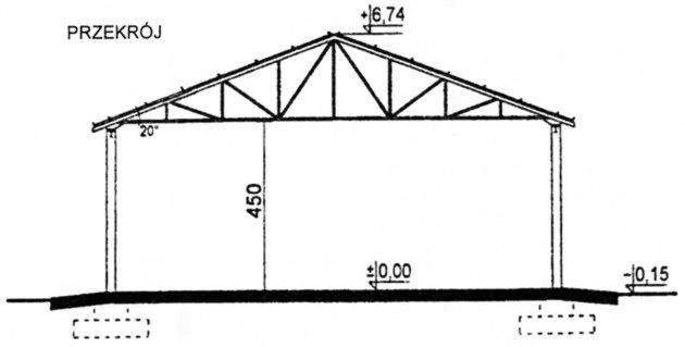 Ściany zewnętrzne: Wiata o konstr. stalowej, nieobudowana, moduł poprzeczny 12 m, moduł podłużny 4,80 m, konstrukcja - stopy fundamentowe żelbetowe, słupy stalowe, wiązary stalowe o rozp. osiowej 12 m. Dach: dwuspadowy, o nachyleniu 20 stopni, wiązary kratowe stalowe, spawane, trójkątne, krycie blachą trapezową na płatwiach stalowych. Poziom kalenicy: 7,05 m od terenu. Dodatkowe informacje: pow. zabudowy: + podjazdy 108 m kw