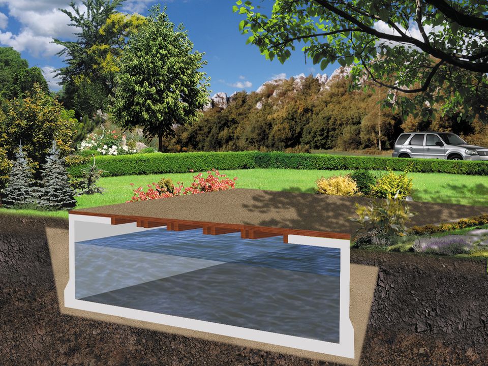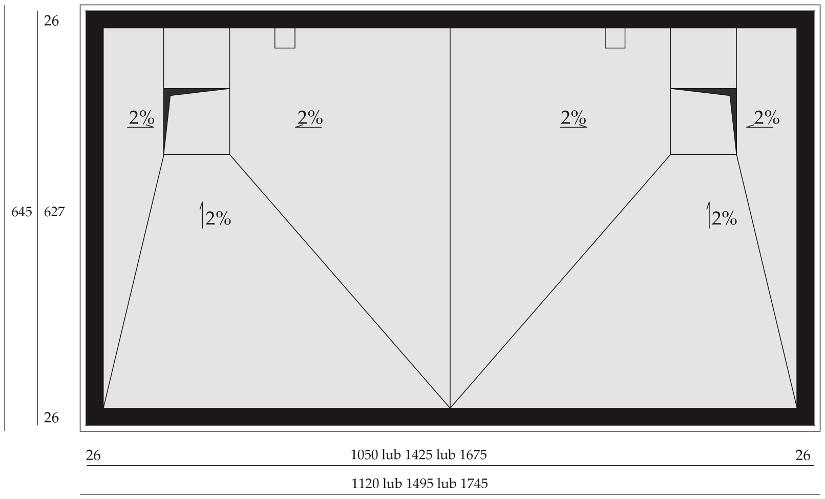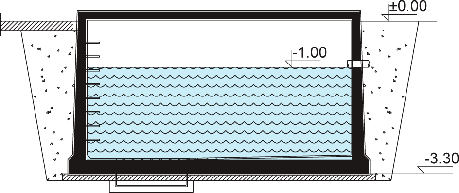 Ściany zewnętrzne: wykonay metodą tradycyjną. Strop: w narożach stropu ( dwa otwory zakryte płytą chodnikową 50x50 albo pokrywa żeliwną w środkowej części stropu zdejmowany drewniany ruszt. Dodatkowe informacje: Zbiornik zagłębiony w gruncie, przykryty, o rzucie prostokątnym