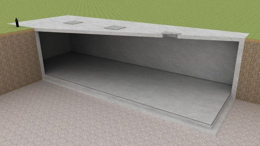 Zbiornik żelbetowy, jednokomorowy, zagłębiony w ziemi, dostęp do wnętrza zbiornika przez trzy otwory włazowe przykryte płytą pokrywową. Żelbetowe płyty i ściany: zbiornik wykonany z betonu C30/37, grubość płyty dennej, jak i ścian bocznych wynosi 25 cm; zbrojenie z siatki prętów – Ø12 co 25 cm (stal A-IIIN RB500).